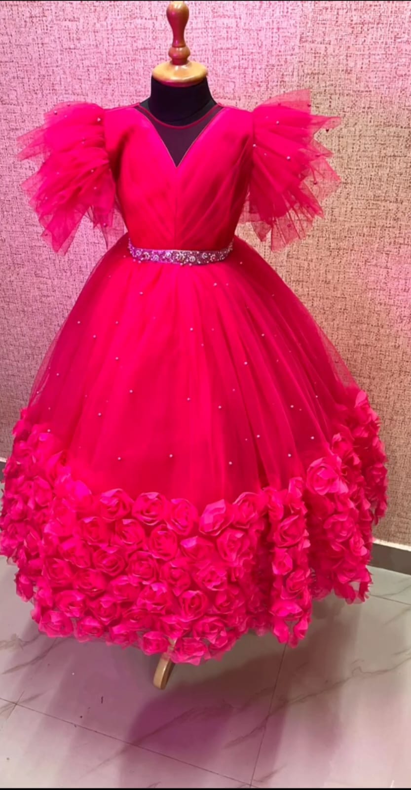 Our exclusive customised kids birthday gown, With a perfect blend of rossettes in pink to flaunt on your beautiful occasion.
